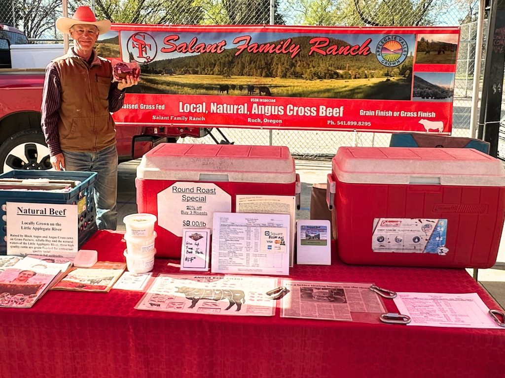 A Beef Cattle Ranch producing beef for you from farm to table. Most steers are born here, and raised their whole lives on spring and summer grass irrigated by waters of the Little Applegate River, or beautiful alfalfa hay in wintertime. This natural beef is also fed quality grain for 60-90 days prior to slaughter, producing that great taste and mouth feel that we all love. For seventeen years I’ve been providing our home-grown beef to the Grower’s Market. All my customers love it, and we both keep coming back! We need to eat beef in moderate quantities, and when we do, we want the highest quality and taste. Salant Family Ranch Beef is the best you can get! There is also grass-finished ground beef available now; our newest addition! Visitors to the ranch are always welcome too. Call 541-899-9295.
